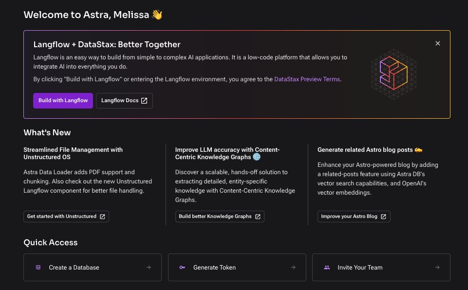 First, log in to your DataStax account. You will be dropped into the Astra DB overview page where you’ll create a serverless vector database.