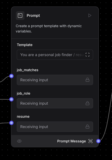 You can feed these three things to our prompt by creating variables within the Prompt component. All you need to do to create a variable is surround a variable name with curly brackets (for ex. {job_matches}) within your prompt and it will appear as a connection point on the component itself.