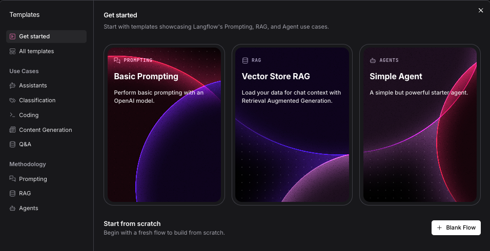 You’re probably wondering now – where does the GenAI part come in? That's where Langflow comes in. Open up Langflow Desktop and create a new flow by clicking the “Create Flow” button, which will bring up this start up menu.
