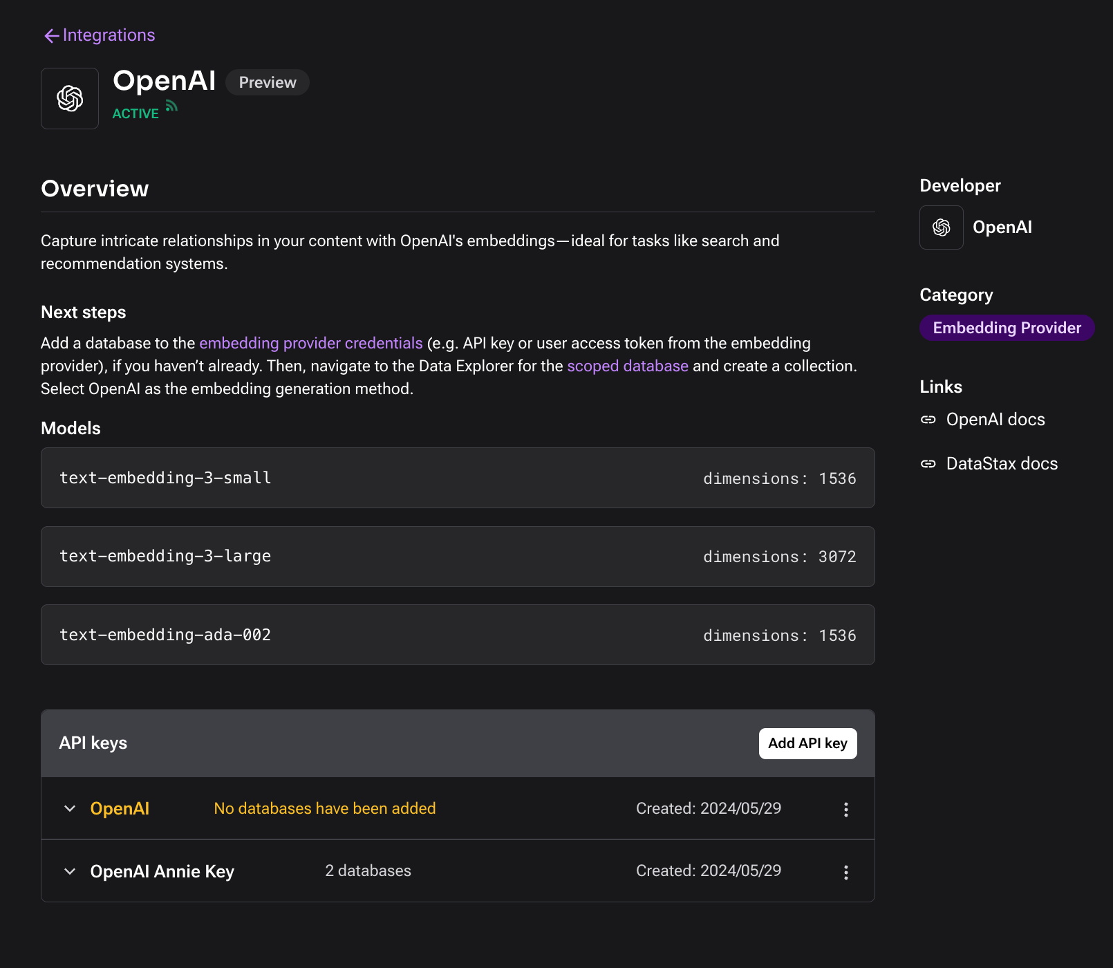 Next you will set up an Integration. You can find the Integrations tab on the left-hand side navigation bar. Astra DB has a selection of integrations that will enable you to use third-party tools and services. For the purpose of this example, you’ll be setting up the Open AI integration to access their embedding models directly from the database.