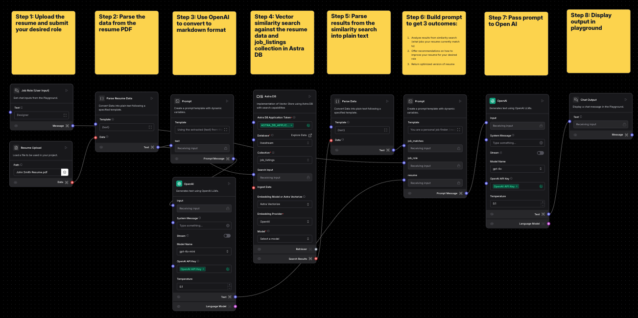 You’ve built a functional GenAI application that can assist with your next job search and help improve your resume using Langflow, Astra DB, and Streamlit. In this blogpost, you learned how to: