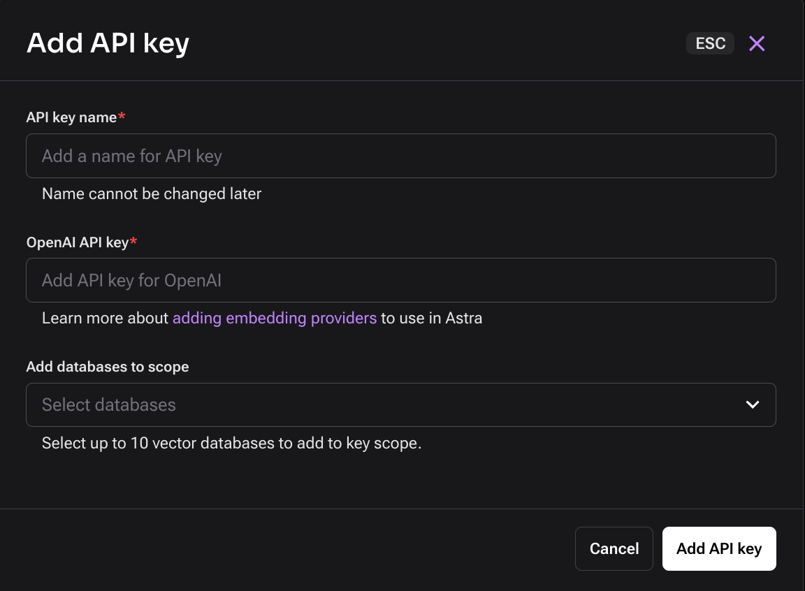 Give your API key a name, your OpenAI key, and for “Add databases to scope” make sure to select the name of the database that you just created.