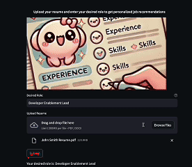 Run streamlit run app.py to start the app—and there you have it! You can test the app by giving it a Desired Role and uploading a resume.