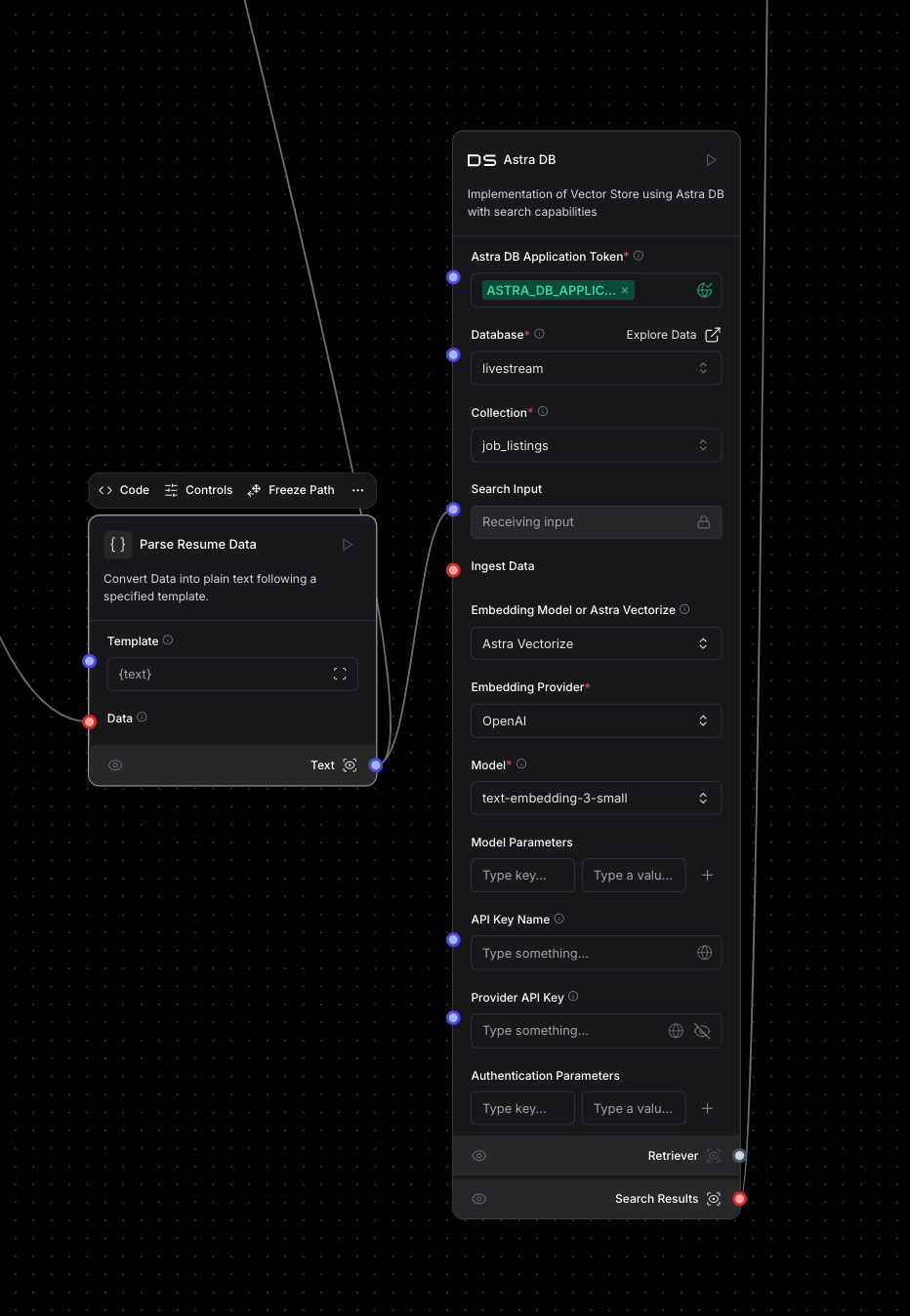 Next, you need the Vector Store component to talk to your Astra DB collection. Here, you take the parsed data from Step 2 and use it as search input for your database. You just expect results that tell you what job listings “match” the current resume. Additionally, if you remember from the ingestion code, you used Astra Vectorize to generate the embeddings for each job listing. In this component, under “Embedding Model or Astra Vectorize” you can select “Astra Vectorize,” which will bring up several other fields for you to identify the respective Provider and Model you used. In this case, that is OpenAI.