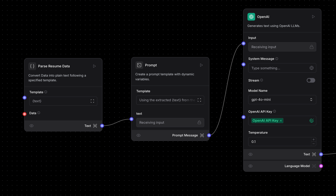 Here's where things start to get a little fancy. Now that you have the textualized data from the PDF, you still want to keep the structure of the resume (headings, subtext, name and email, etc). When building this initially I was looking into different resume parser libraries available in Python, but nothing gave beautiful results. My next thought was to just see if an LLM could do this for me. Here, I used the Prompt component to simply say “Using the extracted {text} from the resume pdf file, please convert this to markdown format as best as possible,” then give it to the OpenAI Models component by simply linking the two together like so: