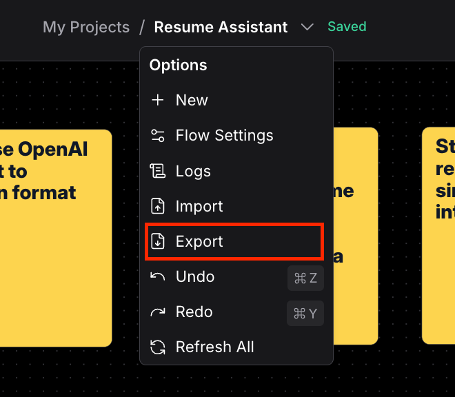 Finally, you’re going to export the flow so that you can reference it in the application. Click the name of your flow at the top of your screen, and select “Export” from the dropdown. This will wrap the contents of your flow into a JSON blob that you can use in Python code. You’ll see how to do this in the next section.