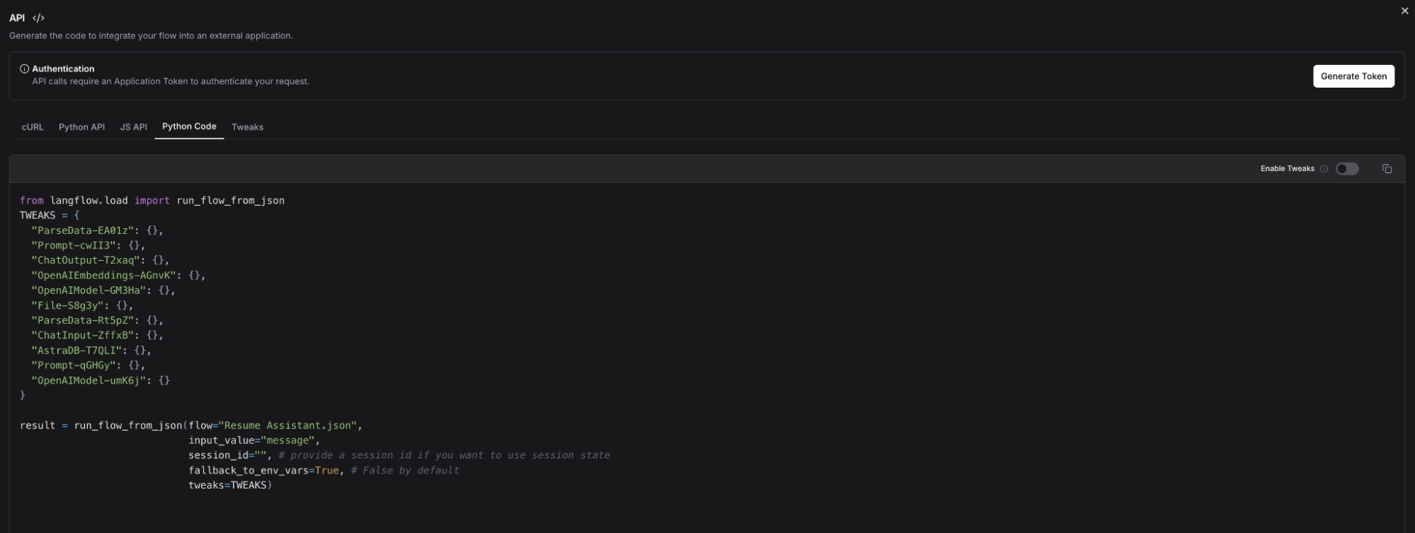 This will bring up a window with several options to connect with your Langflow flow via cURL, JS API, etc. We are using “Python Code.”