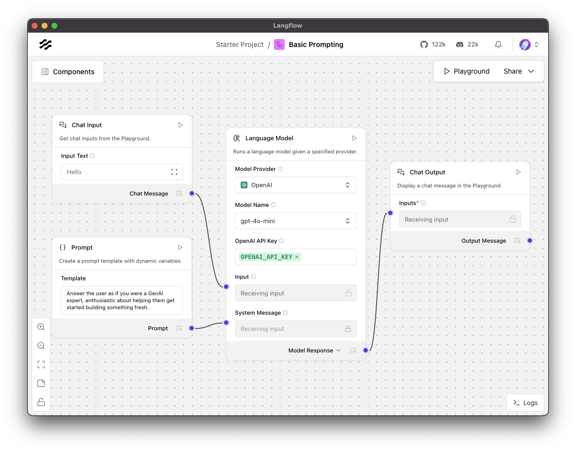 This template takes the message that is sent to a chat input component and feeds it to a model component, OpenAI gpt-4o-mini by default. If you want to use OpenAI for this app you will need to fill in the component with an OpenAI API key. You can choose to use any of the other model components if you would prefer.