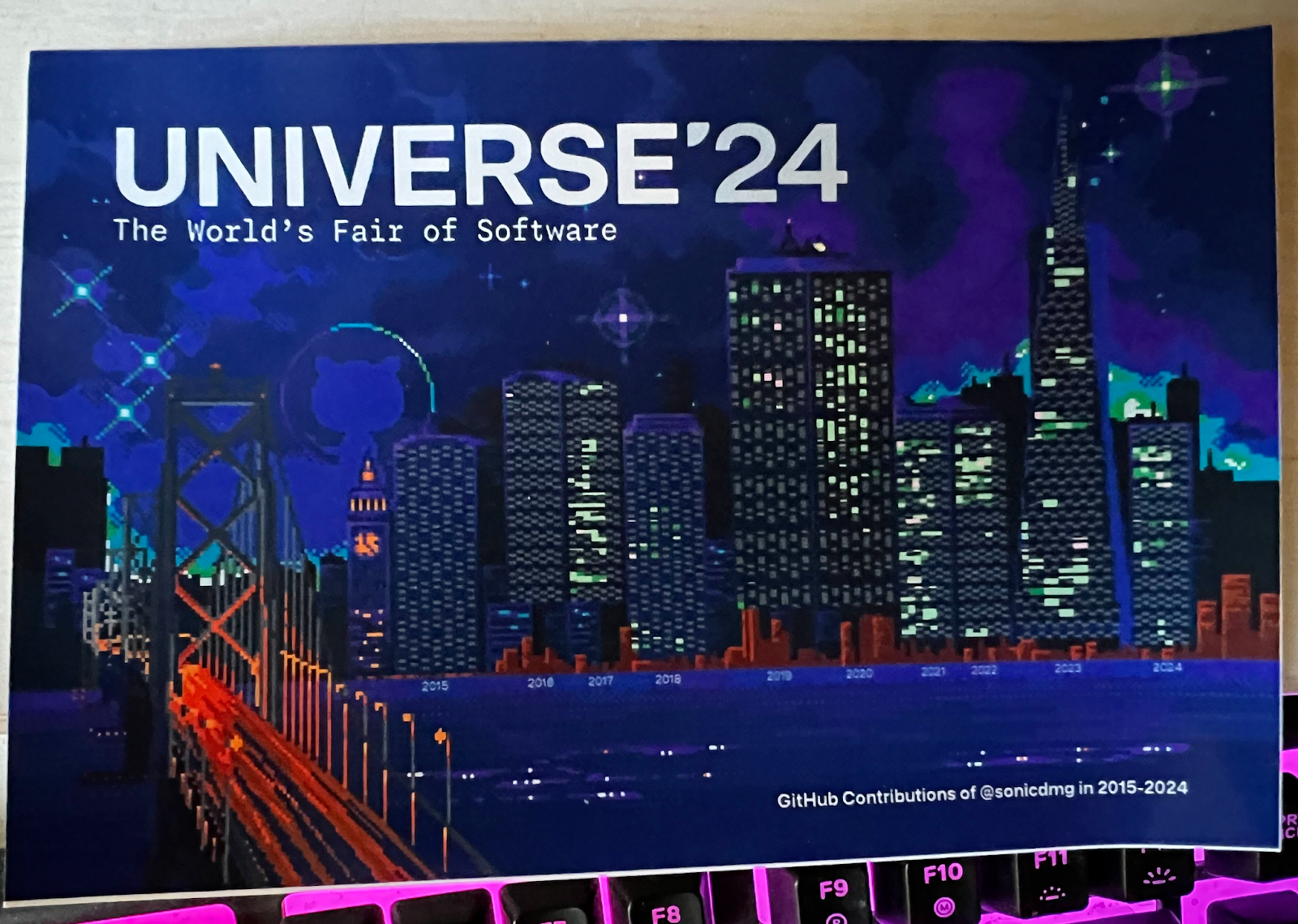 At GitHub Universe, two displays caught my eye. One was a cool enclosure that explored your personal GitHub history, and the other were postcards generated from repo activity.