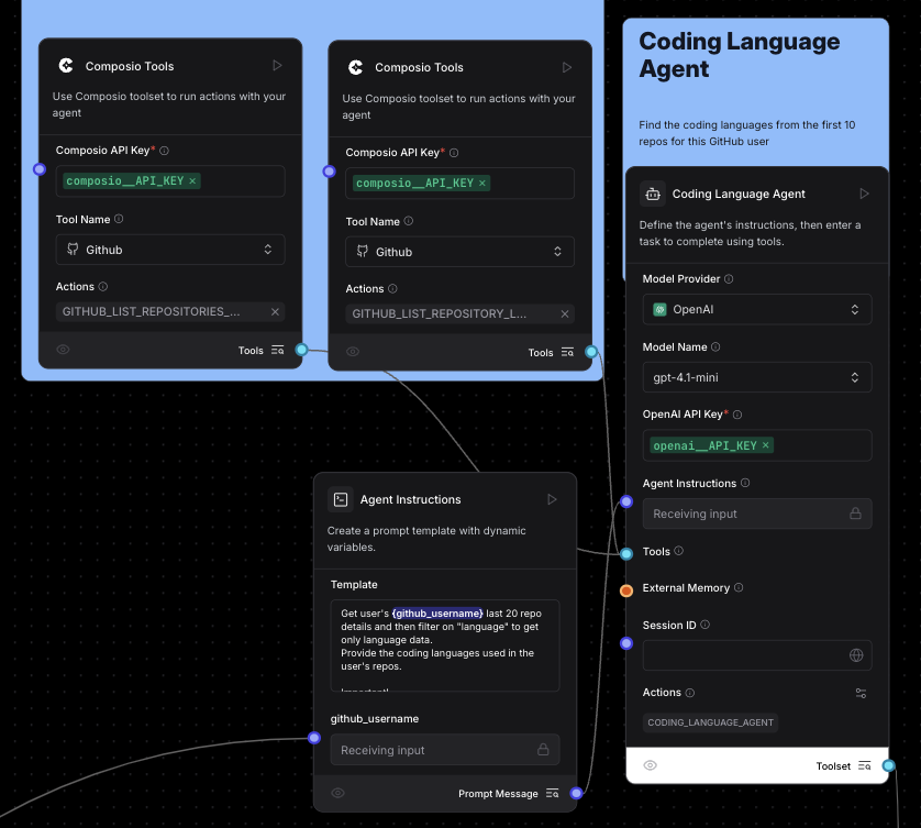 - Coding Language Agent: Gets languages from GitHub repos