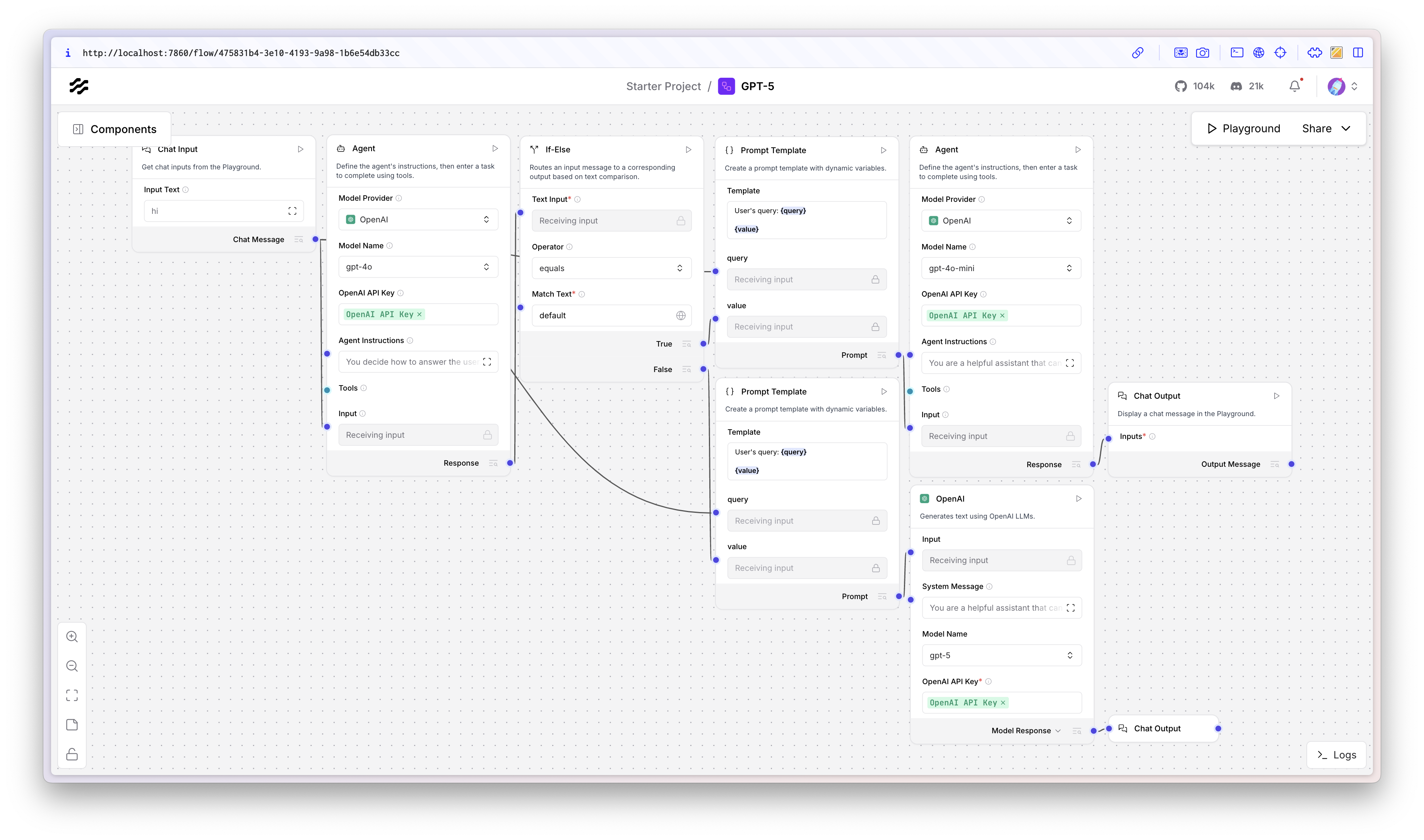 Smart model routing automatically selects the optimal LLM for each query based on complexity, cost, and performance requirements. Instead of using GPT-4 for everything (expensive!) or GPT-3.5 for everything (sometimes inadequate!), you dynamically route each request to the right model. With Langflow's visual approach, you can implement this in minutes, not days, and see exactly how your routing logic works.