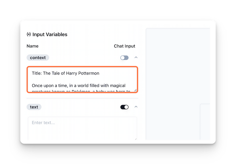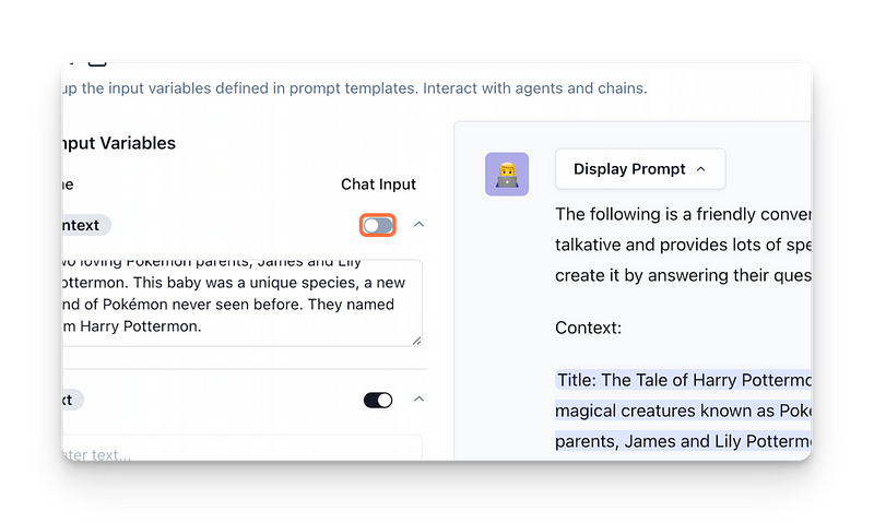 In the chat interface, you can redefine which variable should be interpreted as the chat input. This gives you control over these inputs and allows for more dynamic and creative interactions.
